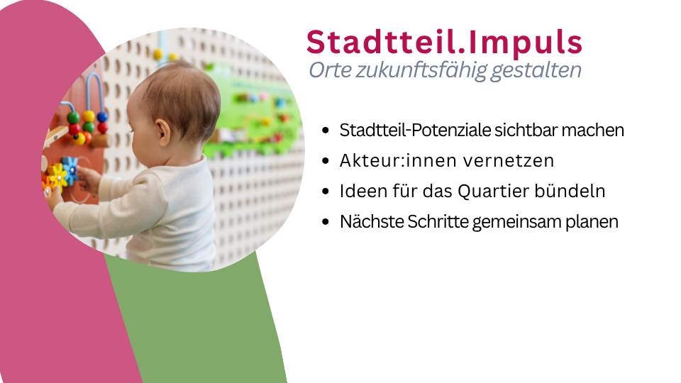 Stadtteil.Impuls ist ein Beteiligungsformat, in dem das Schwarm‑Wissen eines Quartiers sichtbar gemacht wird: Bürger:innen entwickeln gemeinsam Ideen, was ihr Lebensgefühl vor Ort stärkt. In moderierten Werkstätten bekommen Erfahrungen, Bedarfe und Initiativen Raum und Gehör – von der spontanen Idee bis zum konkreten Projektvorschlag. Stadtteil.Impuls kann als Initialzündung für Bürgerbeteiligung dienen oder jährlich wiederkehren, um Wünsche und Prioritäten im Stadtteil transparent zu sammeln und zu spiegeln. Kommunalpolitik und Verwaltung erfahren so aus erster Hand, welche Veränderungen, Angebote und Kooperationen sich die Menschen in ihrem Lebensumfeld wünschen.